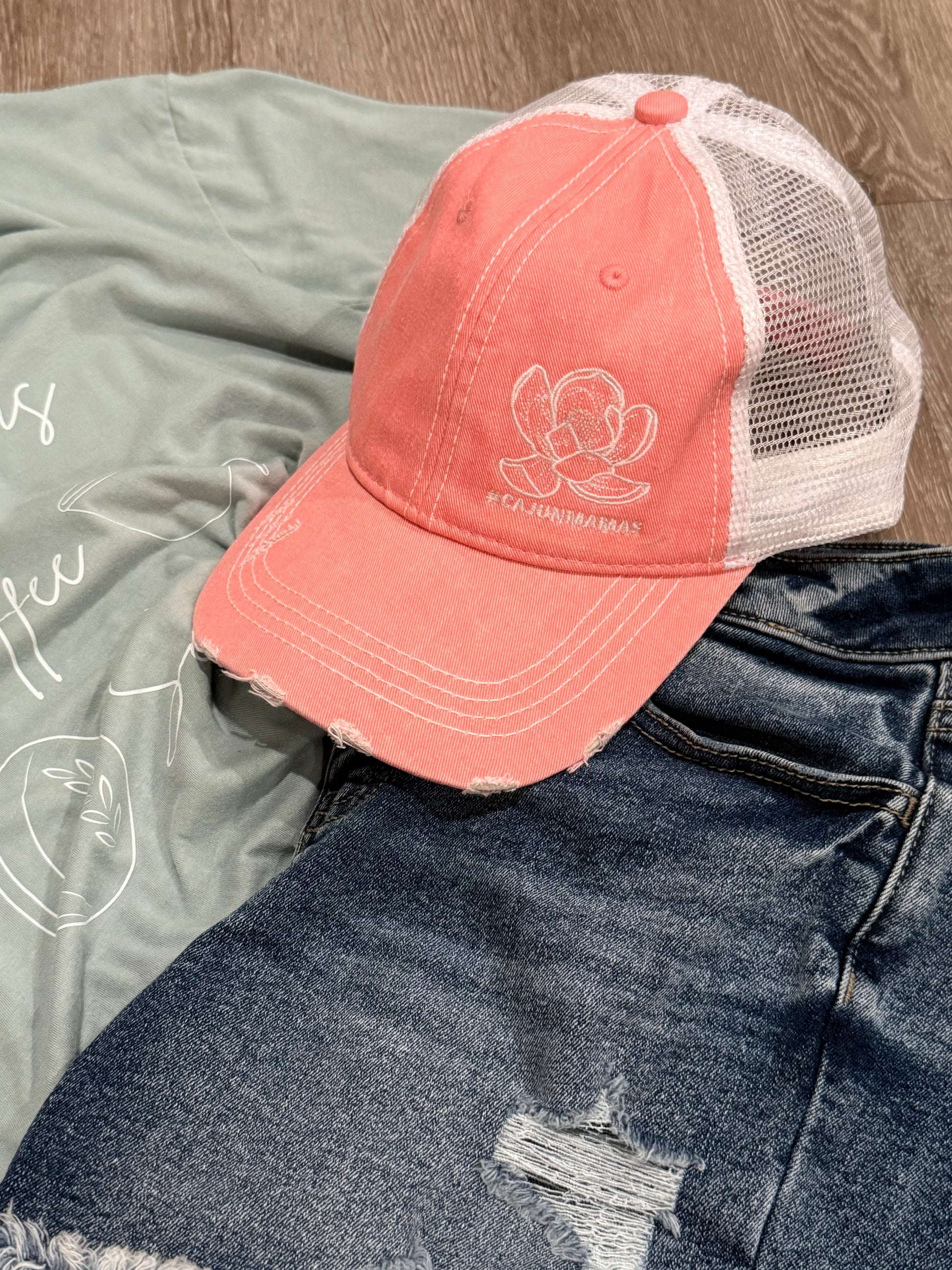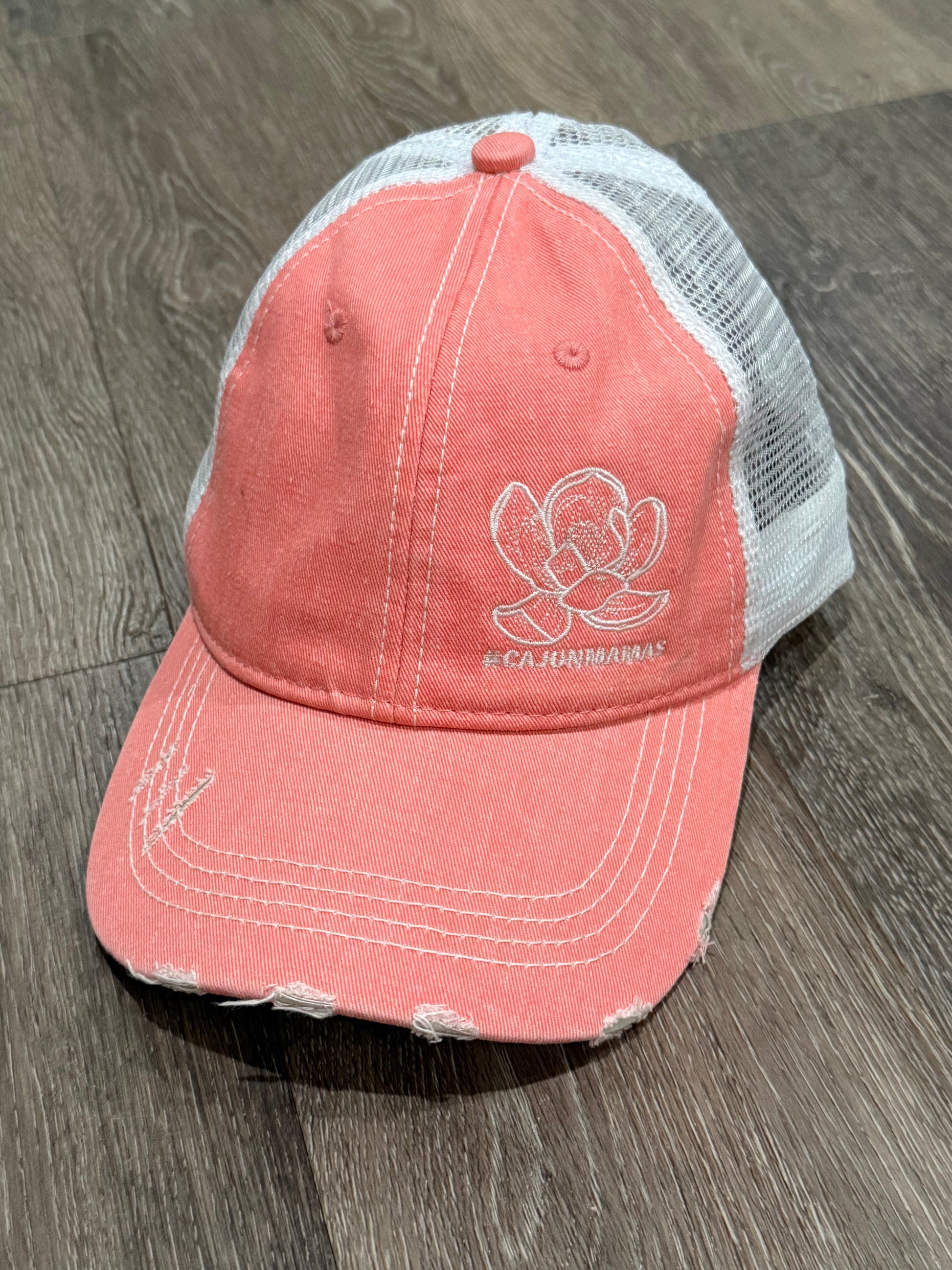 Michele I love this hat so much! The coral color has the perfect pinkness to it and the embroidery is beautiful! Also love the detailed slit for a high pony detail! Love supporting the Cajun Mamas!!