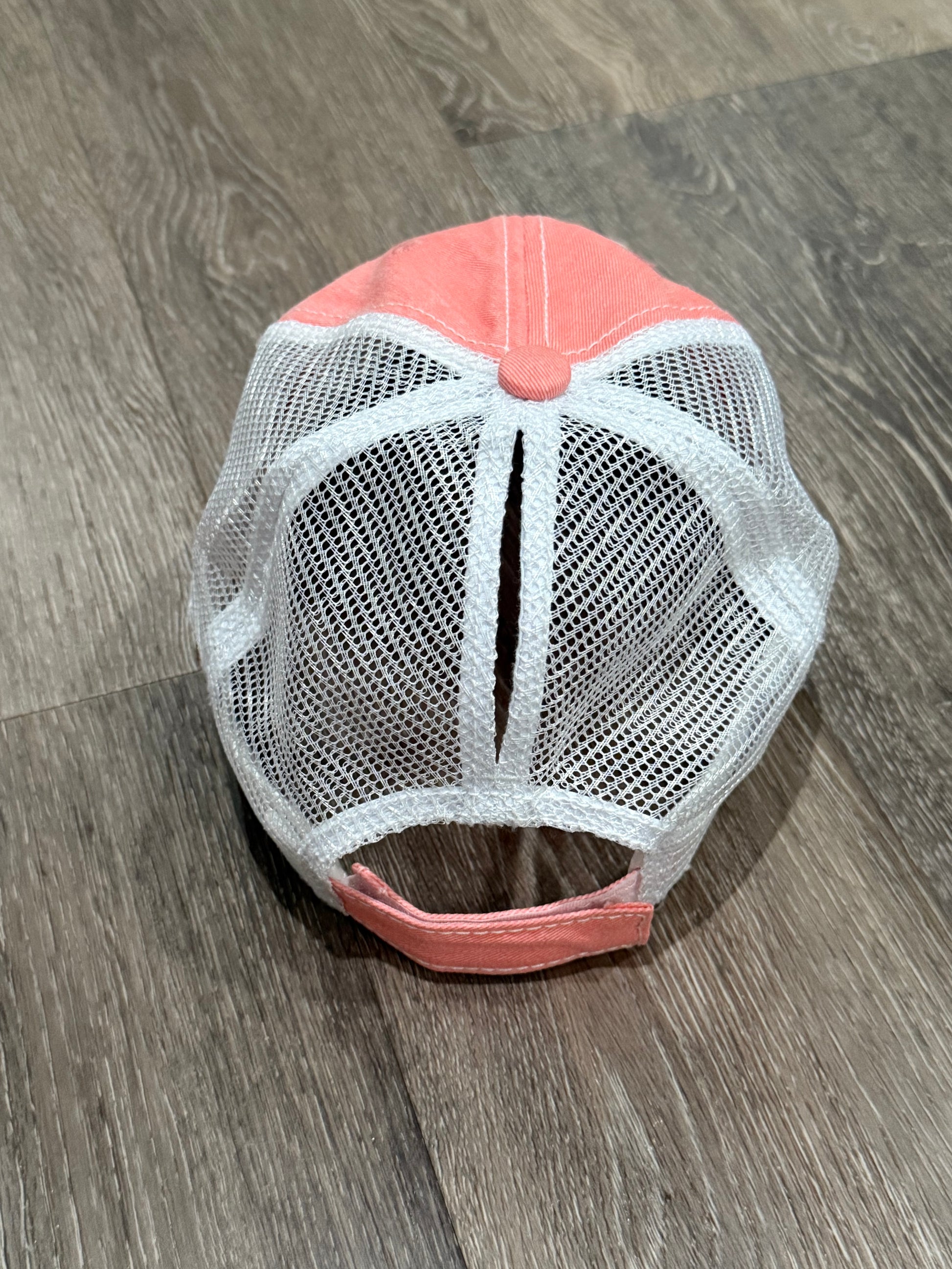 Melon colored cap. White mesh backing. Velcro strap with slit for ponytail.