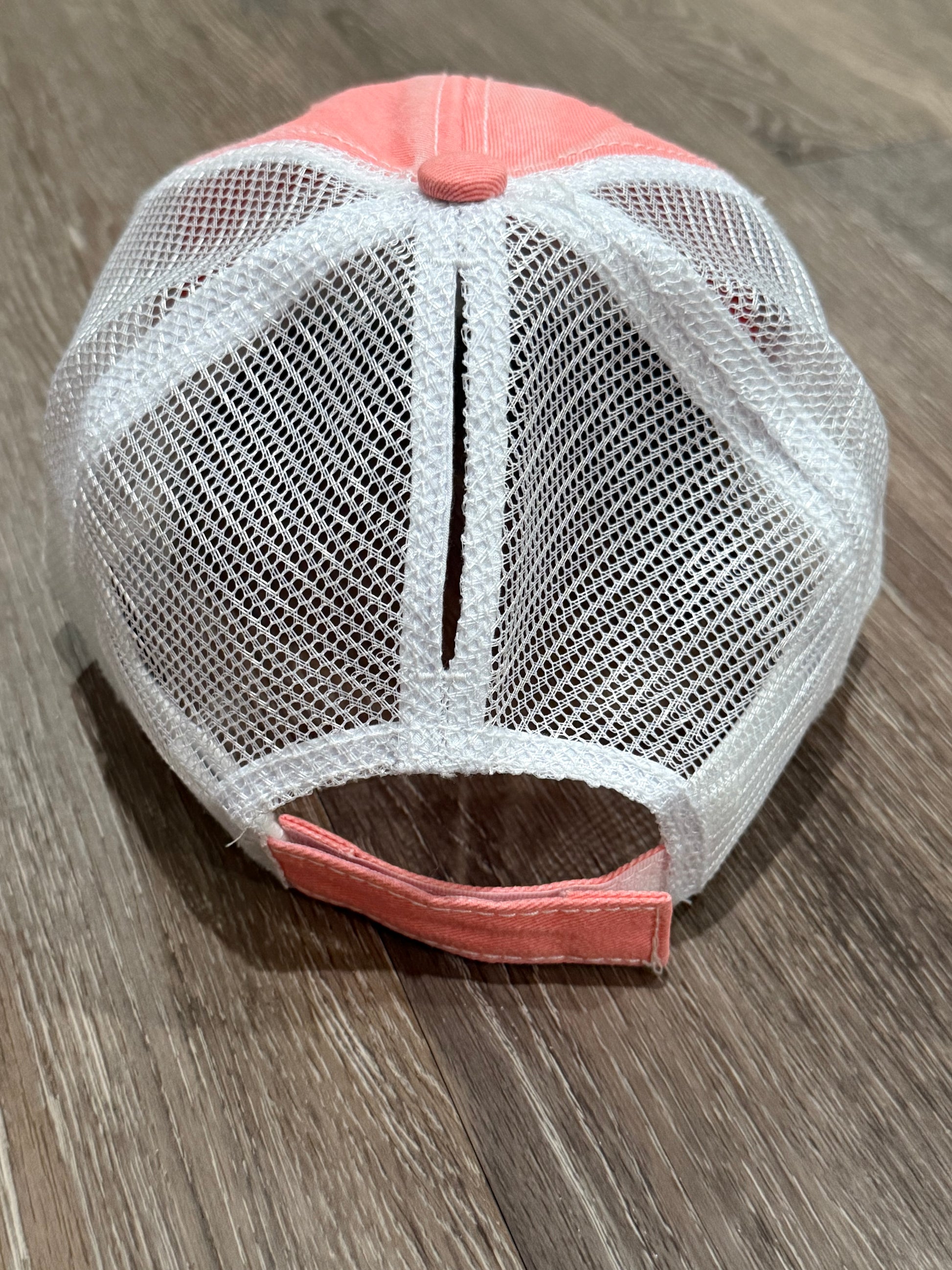 Melon colored cap. White mesh backing. Velcro strap with slit for ponytail.