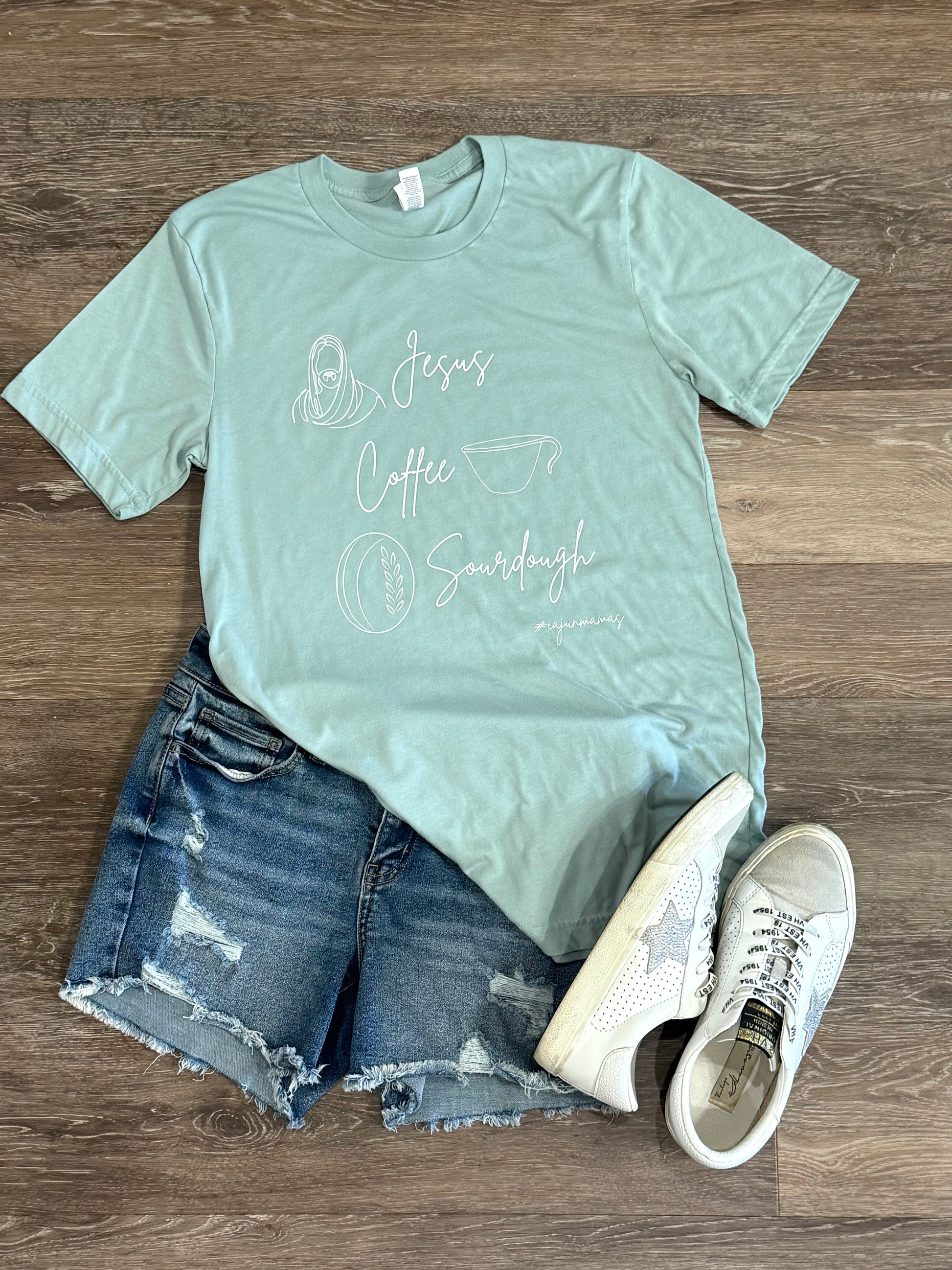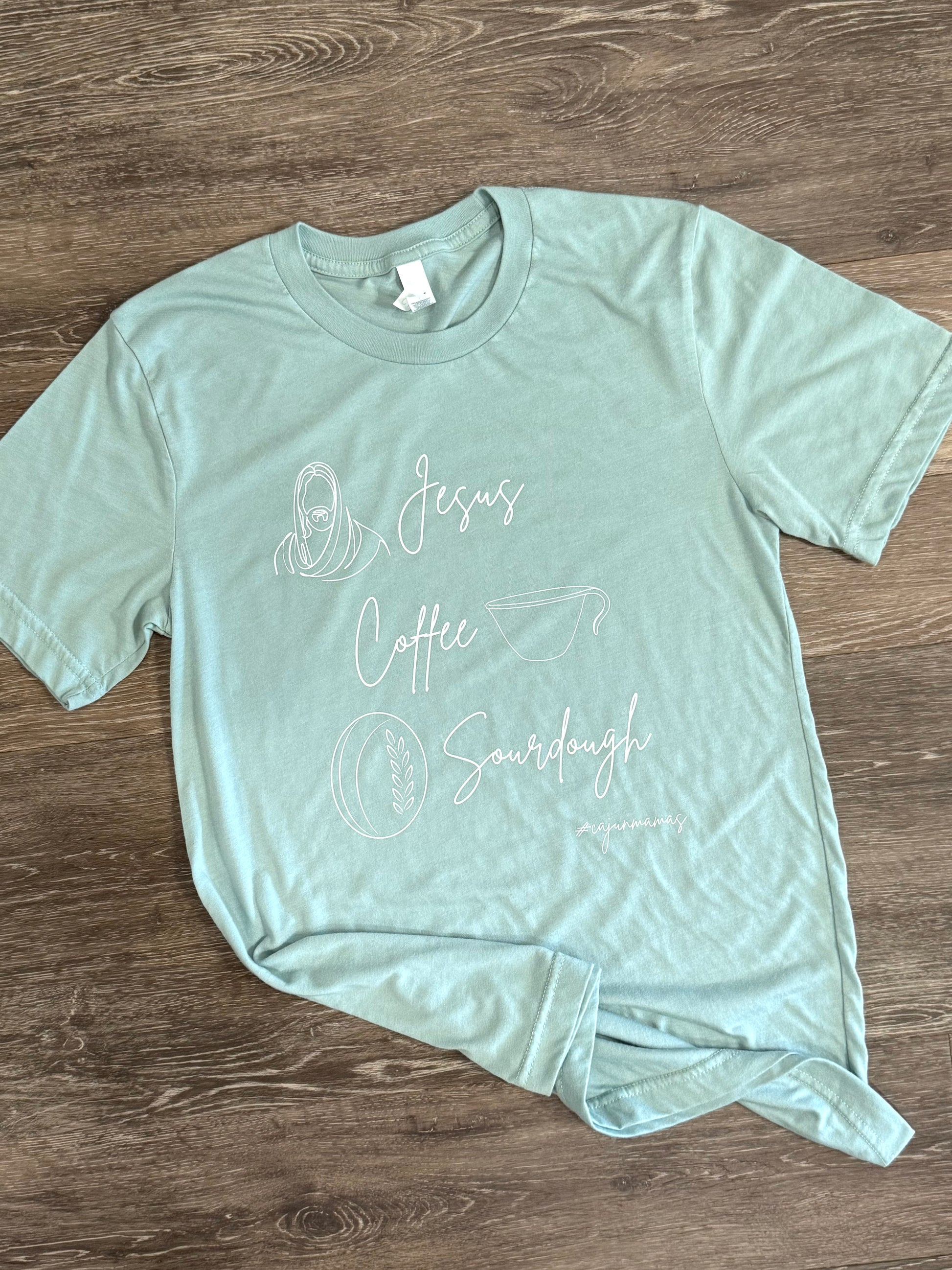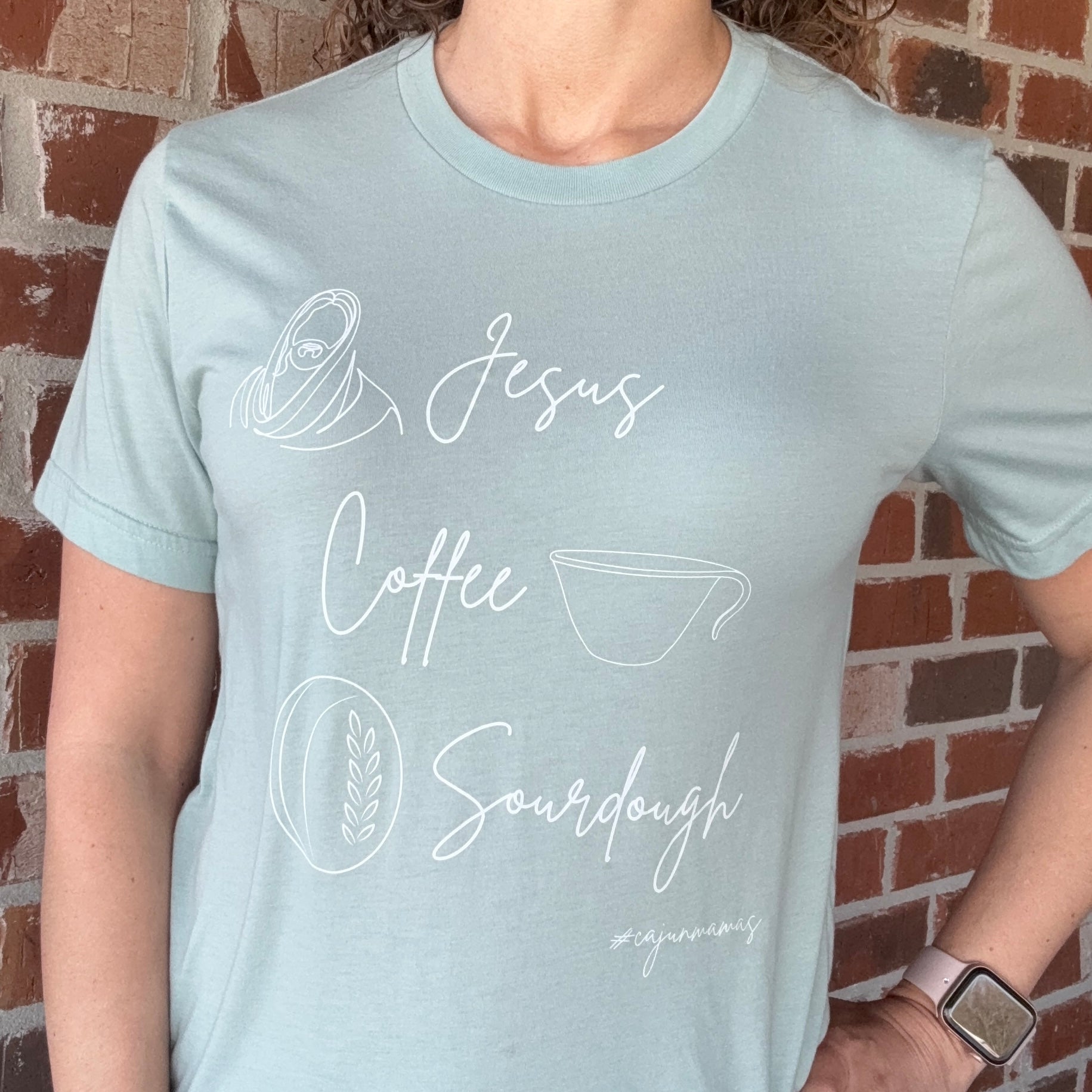 This shirt is dedicated to 3 of our favorite things: Jesus, Coffee, and Sourdough!